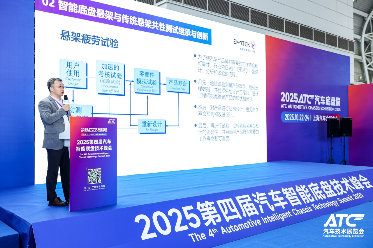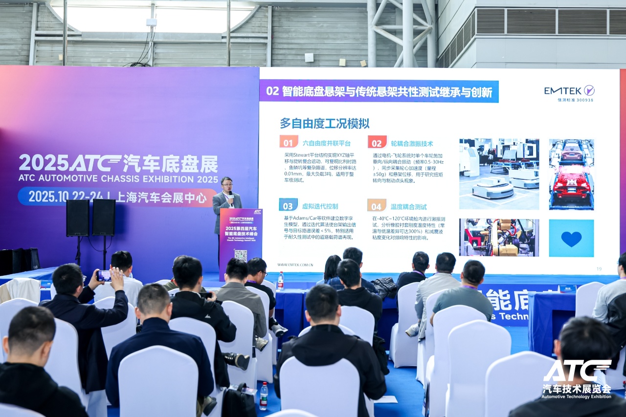 10月22日-24日,2025上海汽車底盤系統(tǒng)技術(shù)展覽會(huì)(ATC汽車底盤展)在上海汽車會(huì)展中心(嘉定)盛大開幕。本屆展會(huì)規(guī)模達(dá)28,000平方米,吸引了全產(chǎn)業(yè)鏈400余家展商及品牌參展,并同期舉辦10+場技術(shù)峰會(huì)與采購配對(duì)會(huì)等活動(dòng)。EMTEK信測標(biāo)準(zhǔn)精彩亮相展會(huì),圍繞汽車智能底盤檢測技術(shù)方案,鏈接產(chǎn)業(yè)資源,助力行業(yè)安全合規(guī)與技術(shù)創(chuàng)新,并以《汽車智能底盤懸架測試研究》為主題參與2025第四屆汽車智能底盤技術(shù)峰會(huì)熱點(diǎn)演講,與海內(nèi)外行業(yè)專家和現(xiàn)場觀眾進(jìn)行了深度分享交流。