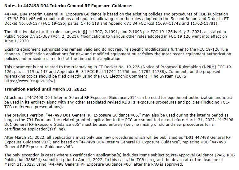 ? 過渡期D04指南必須與其他相關(guān)修訂后的KDB射頻暴露程序和政策一起完整使用;