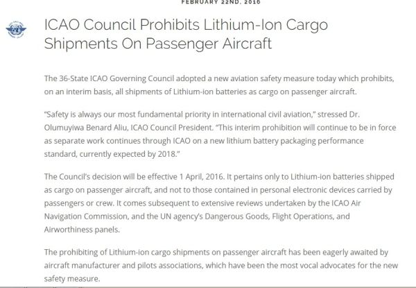 ICAO表決禁制民航客機(jī)運(yùn)載鋰電池,原因是這種電池可以自燃和引起大火,足以摧毀整架飛機(jī)。雖然ICAO理事會(huì)的決定并無(wú)約束力,但大多數(shù)國(guó)家會(huì)跟隨它的做法。禁制將于4月1日生效。包括:
