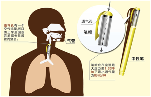 國(guó)家《學(xué)生用品的安全通用要求》明確規(guī)定,書寫筆、記號(hào)筆、修正筆、水彩筆的筆帽應(yīng)至少符合筆帽尺寸(夠大則兒童不能吞咽下去)、筆帽通氣面積(留有小孔,如不慎吞下不至窒息)或筆帽空氣流通(有掛鉤之類物體,在不慎被吞時(shí)可以保持一定的空氣流通)三項(xiàng)要求之一。