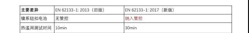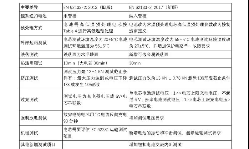 2017年5月12日,歐洲電工標(biāo)準(zhǔn)化委員會曾發(fā)布了EN 62133:2017版,分別為鎳系電池適用的EN 62133-1: 2017及鋰系電池適用的EN 62133-2: 2017。該兩版標(biāo)準(zhǔn)已于2020年3月14日起在歐洲強制實施,同時舊版(EN62133:2013版)將不被接受。